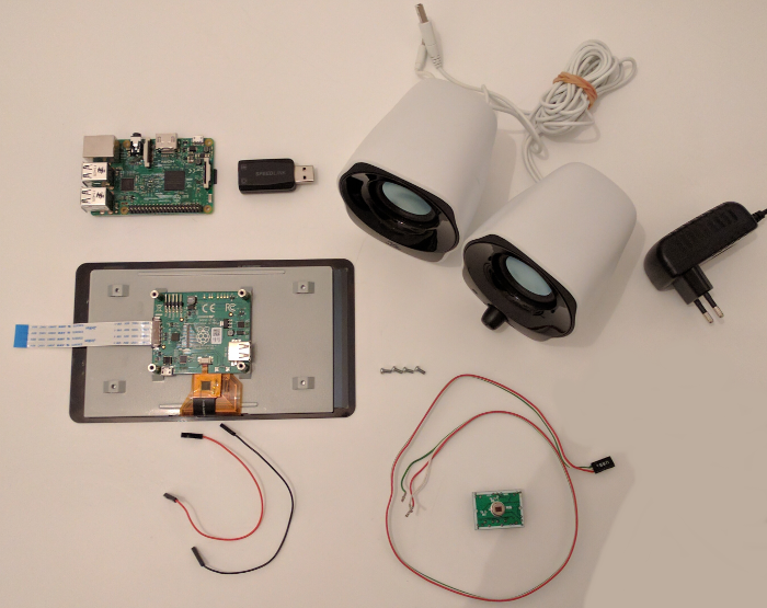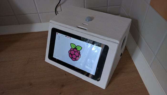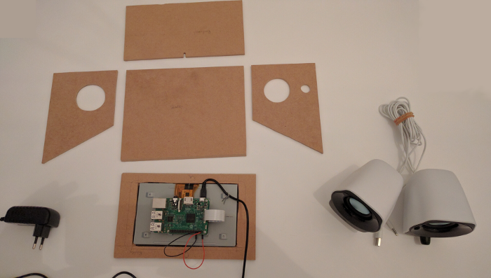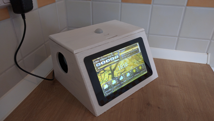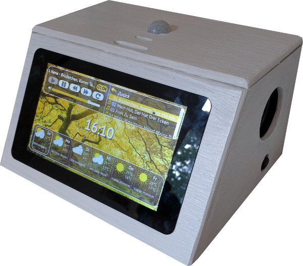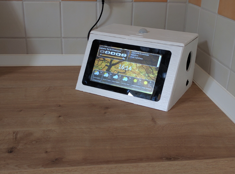Yeah, sorry. You have to build it first. This is just the documentation of how I glued together a touchscreen-box to play streams and mp3 in our kitchen. Afterwards I thought it'd be nice to show us the weather in the morning and liked the idea of letting it read the news, react to our presence, slide photos and so on. Things escalated.