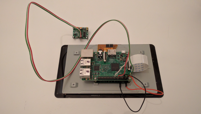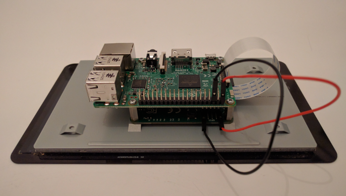 Attach the Raspberry Pi to touchscreen's controller board. Connect ribbon cable, power (pin 2) and ground (pin 6).